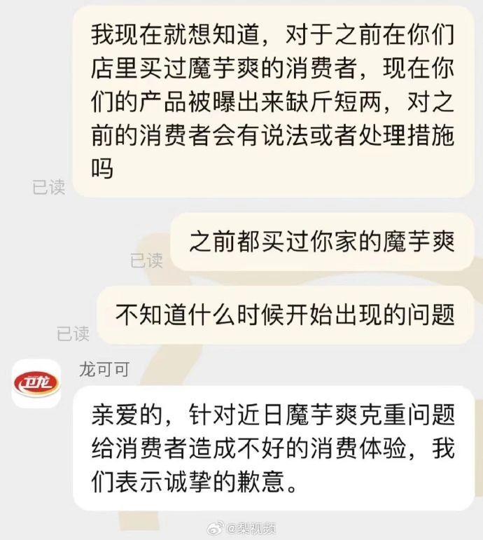 5月23日,知名零食品牌卫龙旗下产品卫龙魔芋爽克重不足引发广泛关注。据媒体报道,产品标注15克,实际带包装只有8.9克。