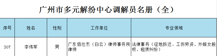 根据《广州市多元解纷中心调解员管理办法(试行)》相关规定,经广州市多元解纷中心理事会严格审议,广东佰仕杰律师事务所白云分所主任李伟军律师凭借在征地拆迁、租赁纠纷等领域的深厚专业积淀与丰富实务经验,成功入选广州市多元解纷中心调解员名册,荣获调解员资质!