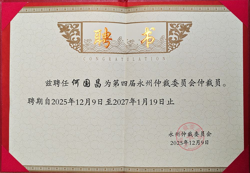 未来,何国昌律师将以第四届永州仲裁委员会仲裁员的专业身份,恪守公平公正的职业初心与准则,凭借自身专业积淀与实战经验,为各类商事纠纷的高效、合规、专业化解持续注入动能,充分彰显法律人的责任担当与行业公信力。