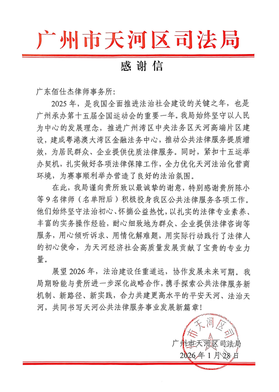 近日,广州市天河区司法局特致信广东佰仕杰律师事务所,对我所黄旭凯、徐进、陈小、黄富威、王磊、张建明、吴予笑、邱世文等九名律师在2025年度公共法律服务各项工作中的突出贡献,致以诚挚感谢与高度肯定!